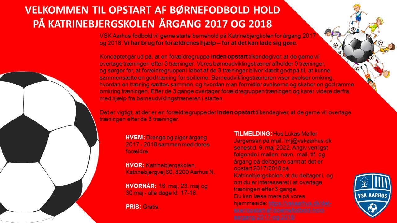 VSK Aarhus fodbold vil gerne starte børnehold på Katrinebjergkolen og Ellevangskolen for årgang 2017 og 2018. Vi har brug for forældrenes hjælp – for at det kan lade sig gøre.